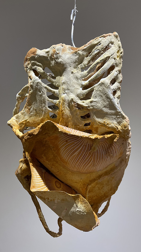 HANGING CAGE back view ← Previous Next → Hanging Cage, 2023, carborundum prints on paper formed over paper clay, plastic, metal, pigments, 26 x 14 x 12 inches Hanging Cage, 2023, carborundum prints on paper formed over paper clay, plastic, metal, pigments, 26 x 14 x 12 inches